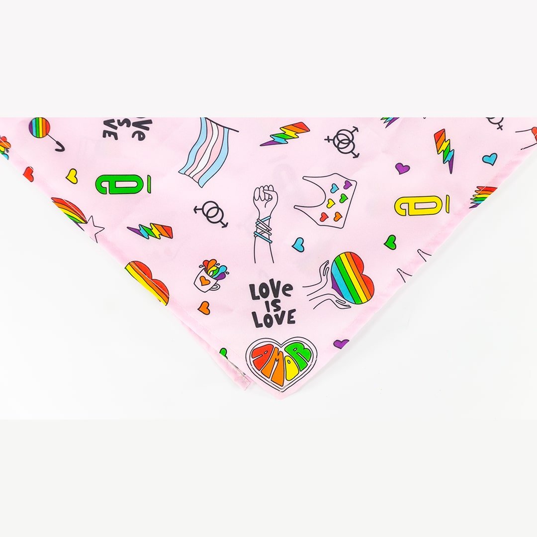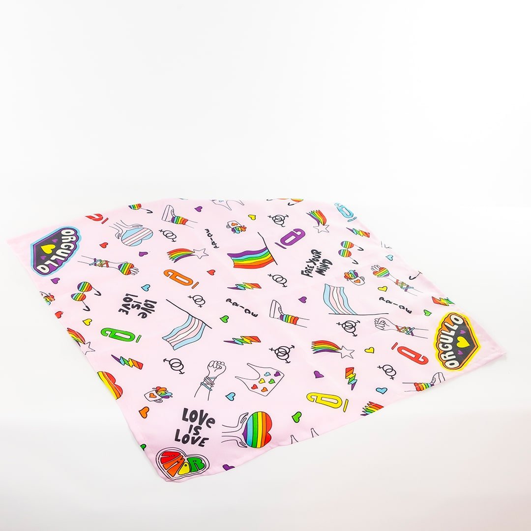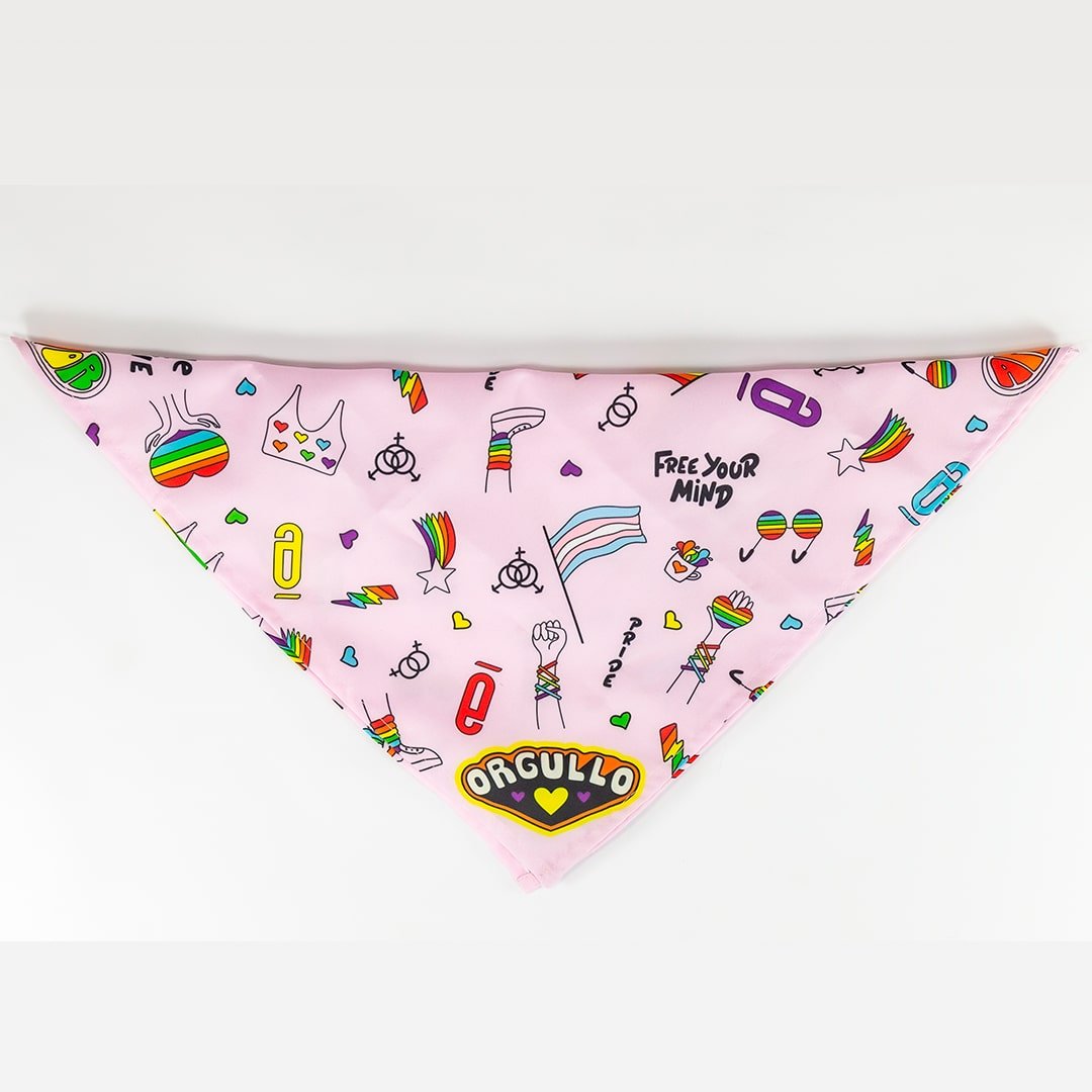 Dos pañoletas sublimadas por un solo lado con ilustraciones referentes al Orgullo LGBTIQ+.
